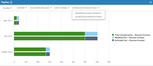 The Pipeline dashpart provides a visual summary of estimated fees and predicted revenue for projects. With the latest release, users can forecast the project revenue based on the allocation method defined within the project, including revenue forecasts. This option provides more control on how users are viewing future revenue.