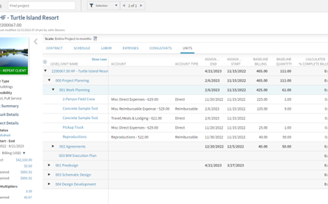 Give your project managers greater confidence in their total project costs and schedules with unit planning. While project managers can plan in hours, most projects also have a need for costs that are not hourly. Now, project managers can plan in quantities in addition to labor, consultants and expenses for a better overall view of their projects. This allows PMs to plan for things like survey crews, tests, equipment, inspections and much more. PMs can plan labor or expense quantities across calendar periods with unit planning. Note that to take advantage of this, the firm must own the resource planning module.