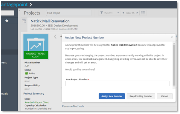 With the latest release, companies now have more flexibility in their workflow to support their business need. If firms want to use separate numbers for pre-award and awarded projects, the in-pursuit project or opportunity number can be changed when approved for use in processing. The pre-award numbering can be used with or without auto-numbering for projects.